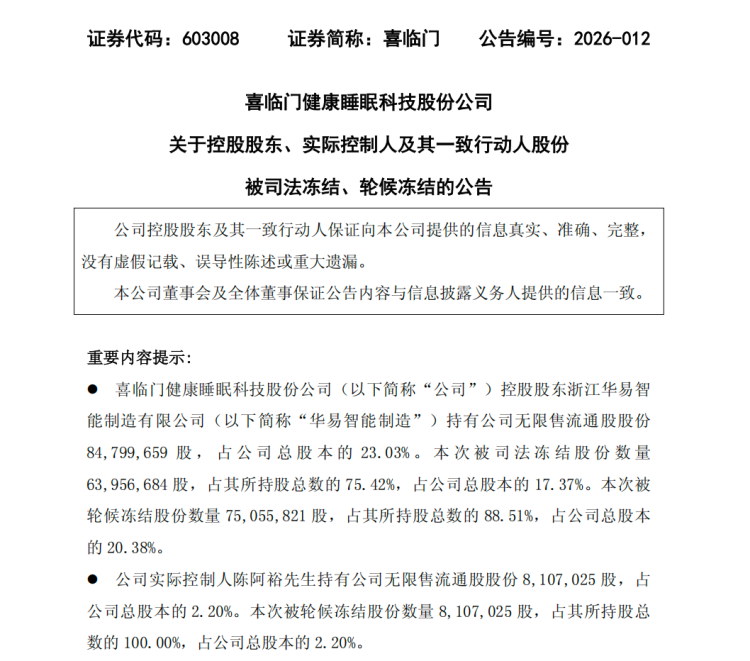 【环球网综合报道】4月6日,喜临门发布公告称,公司控股股东浙江华易智能制造有限公司及其一致行动人所持公司股份遭遇大规模司法冻结及轮候冻结,合计涉及公司总股本的25.08%被司法冻结,24.86%被轮候冻结。