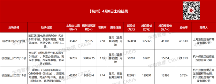 4月8日,杭州迎来3宗涉宅用地出让。根据成交结果,3宗地块均以溢价成交,最高溢价率超46%,共计收金约58.62亿元。