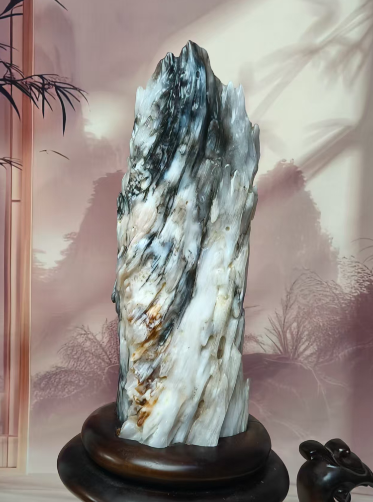 其胎体为纯净致密的白瓷质体,由硅土与高岭土天然融合而成,质地温润细腻、坚密如古瓷;纹饰则为墨蓝或丹青色的钴蓝藻纹,由远古蓝藻类植物与树木遗骸共生,经硅化冷凝过程天然形成,晕染自然如青花,写意灵动似水墨。与人工青花瓷不同,树化冷凝青花瓷表面自带天然瓷光与珍珠光泽,莹润内敛,不施釉却胜似施釉,是地球唯一无需人工干预即可形成的“上古青花瓷”,也被学界称为“天然青花瓷”。