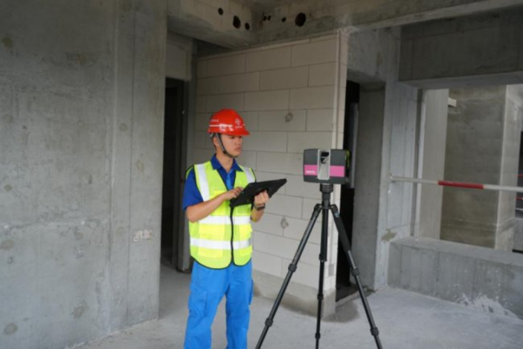 走进室内装修现场,腻子涂敷机器人正有条不紊地开展作业,成为精装修环节的“效率担当”。机器人通过预设程序精准控制机械臂动作,将腻子均匀涂抹在墙面上,涂层厚度误差严格控制在1毫米以内,很大程度上避免了人工操作中常见的“流坠”“透底”“厚薄不均”等质量通病。同时,其施工效率达到人工操作的2至4倍,大幅缩短了室内装修周期,为项目回迁冲刺抢出了宝贵时间。测量机器人搭载激光扫描与AI自动取尺技术,快速对住宅空间进行全方位扫描,实时生成高精度3D云模型,墙面平整度、垂直度、阴阳角直线度等关键数据一键采集、自动上传、精准分析,实现“扫描即测量、数据即成果”。